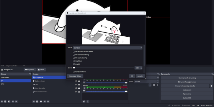Une fois le plugin installé, vous aurez accès à une nouvelle source nommé « bongobs cat », dans les propriétés de laquelle vous pourrez faire quelques ajustements, voire changer de skin, même si le clavier est en qwerty, c’est tout de même rigolo et il ne restera plus ensuite qu’à ajuster la source et la placer dans un coin, ou dans un cadre pourquoi pas, ça fera son petit effet, c’est rigolo, c’est une des nombreuses solutions qui existent si vous n’avez pas de webcam ou que vous ne vouliez pas montrer votre visage en live.
