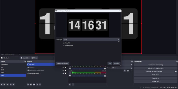 Avec le plugin Flip Clock, on va pouvoir afficher l’heure simplement en stream, sous la forme d’une horloge à clapet. Et pour ça, rien de plus simple, après avoir installé le plugin on pourra ajouter une nouvelle source pour ajouter cette fameuse horloge. Il y a quelques réglages basiques, comme la possibilité d’afficher les secondes, de passer au format 12 heures, mais on peut aussi décider de faire un compteur ou un compte à rebours qui sera pilotable via les propriétés de la source.