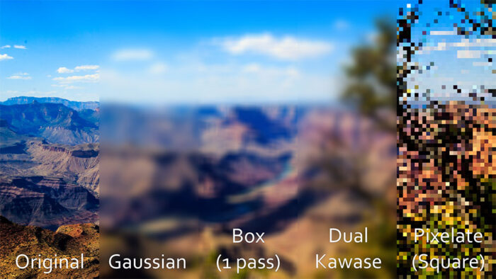 Et maintenant, on a encore mieux avec le plugin Composite Blur. C’est pareil, c’est pour flouter, mais il y a tellement d’options, c’est incroyable. On retrouve bien sûr les principaux algorithmes de floutage, comme pour le plugin de flou simple, mais aussi différents effets comme le floutage de zone, le flou directionnel, le flou de mouvement, le flou de zoom, le flou qui simule une mise au point d’objectif photo…
