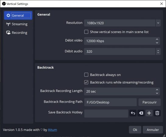 - Fonctionnalité Backtrack : la laisser toujours actif, la lancer automatiquement durant un stream ou un enregistrement, définir la durée qui doit être gardée en mémoire, le chemin de sauvegarde des clips, on peut aussi définir un raccourci clavier pour activer le Backtrack