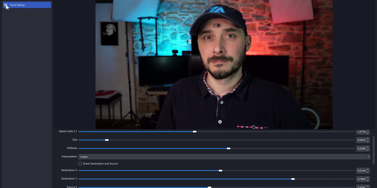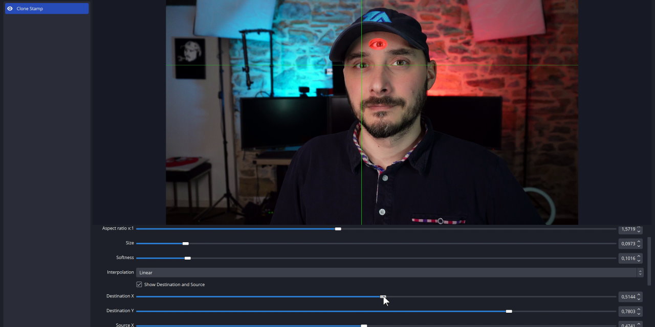 Eh bien on peut faire pareil sur OBS grâce au script Clone Stamp, littéralement tampon de clonage. Après avoir chargé le script dans OBS, on aura un filtre qu’on pourra appliquer sur une source image ou vidéo. Ensuite ce n’est qu’une question de réglages pour faire disparaître un élément du décor par exemple, il y a la possibilité d’afficher la zone source et la destination du tampon.