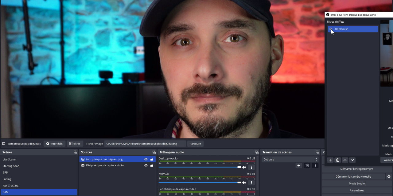 Script suivant, un script qui va prendre soin de votre peau puisqu’il va ajouter un filtre qu’on pourra appliquer sur une image, ou sur une caméra, et qui permettra de lisser le rendu. Ça aussi c’est assez courant dans la retouche photo, et je ne suis pas un expert, loin de là, mais une fois le script chargé et le filtre DeBlemish ajouté sur une image, j’ai pu afficher le masque pour voir la zone qui allait être lissée. Ensuite il y a plein d’options sans doute intéressantes si on creuse un peu ou qu’on maîtrise déjà un peu le sujet, mais histoire de vous montrer un avant/après, j’ai forcé le trait sur le lissage et vous voyez que si j’active puis désactive le filtre, on voit quand même la différence.