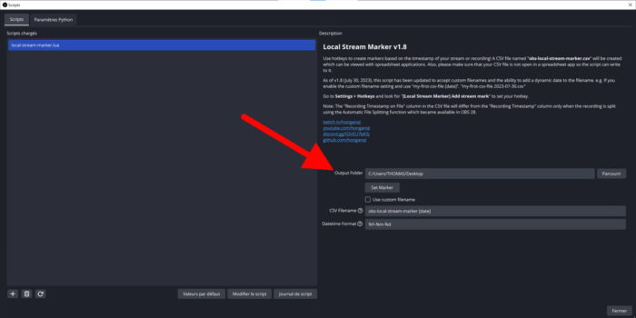 Bon là on est limite en train de transformer OBS Studio en Photoshop avec tous ces scripts, donc on va revenir aux scripts plus fonctionnels, notamment Local Stream Marker qui permettra d’ajouter un marqueur sur un enregistrement (ou un stream). Vous le savez peut-être, mais c’est une fonctionnalité qui existe sur Twitch, on peut ajouter un marqueur durant un stream à un moment bien précis, ça permet de retrouver le moment en question très rapidement sur la VOD, et ces marqueurs on peut les placer via une action rapide dans le Gestionnaire de stream, directement sur Twitch, ou via un Stream Deck, etc.