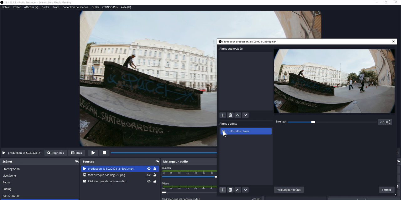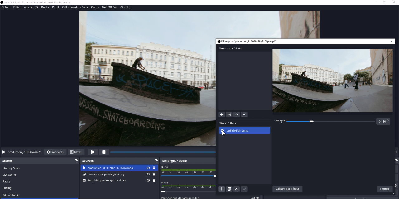 Eh bien avec le script UnFish Lens, on va pouvoir se débarrasser de cet effet tout simplement en ajoutant un filtre sur notre source et en faisant glisser le curseur d’intensité, on ne peut pas faire plus simple.