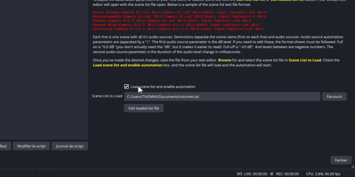 Et on termine avec un dernier script nommé Volume Automation per Scene qui va permettre… d’automatiser les volumes de chaque source audio pour chaque scène. En gros, si la scène d’intro vous voulez que le micro soit coupé avec la musique à fond, et que sur la scène de discussion le micro soit activé avec la musique baissée, ce script permet d’automatiser tout ça.