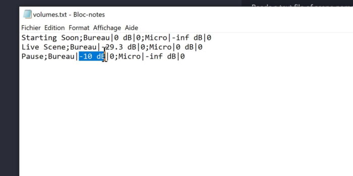 Alors pour ça j’ai utilisé la syntaxe indiquée dans la description du script, en créant un fichier texte banal et en ajoutant une scène par ligne, j’ai renommé mes sources audio pour que l’exemple soit plus simple, et donc là dans mon fichier, sur la scène de démarrage, j’ai le son système avec la musique à fond et le micro coupé, sur la scène de discussion, j’ai le volume système baissé à 29,3 dB et le micro à fond, et sur la scène de pause, j’ai le volume système sur lequel j’ai ma musique à -10 dB et le micro coupé.
