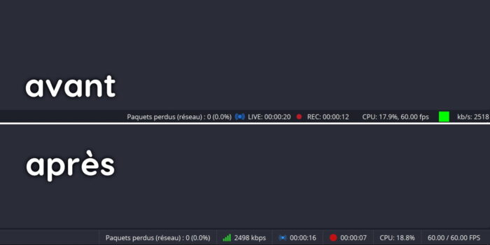 Première réelle nouveauté, ce n’est pas grand-chose mais la barre de statut d’OBS a subi un petit lifting plutôt sympa. Cette barre de statut, on la connaît bien car c’est dans cette dernière qu’on peut voir si la connexion se fait bien avec la plateforme de stream, avec le fameux carré vert qui pouvait passer au orange voire au rouge, signe que ça allait couper pour les viewers. Eh bien outre le changement de design subtil, les infos de débit sont désormais placées à côté du timer lié au streaming, ce qui est somme toute plus logique, et ça rend plutôt bien, c’est vraiment propre. Donc encore une fois pas grand-chose, mais on salue évidemment l’effort d’améliorer toujours plus l’interface utilisateur d’OBS.