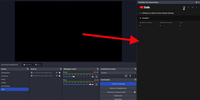 On en vient à un gros morceau de cette mise à jour 30.0 d’OBS Studio. Il y en a chez qui ça en touchera une sans faire bouger l’autre, mais ça concerne les streams sur YouTube, avec un nouveau dock qui fait son apparition en plus du chat YouTube apparu avec la version 27.1, c’est le panneau de contrôle. Donc en gros, ce panneau de contrôle qu’on a dans notre YouTube Studio quand on lance un stream, il sera disponible en tant que dock dans OBS une fois le live lancé, avec les quelques infos qu’on peut y trouver bien entendu, mais aussi les icônes fonctionnelles, comme la possibilité d’ajouter une coupure pub ou de partager le live sur les réseaux sociaux, on a aussi la possibilité de choisir pour quel flux afficher les informations si on a plusieurs streams en cours…