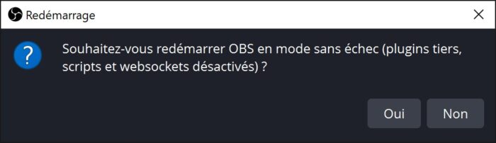 Nouveauté suivante, petit ajout qui concernera au final assez peu de monde, mais c’est l’apparition d’un mode sans échec pour OBS, comme pour Windows. Cette fonctionnalité permettra de démarrer OBS sans lancer les plugins et autres scripts rajoutés, et ce à des fins de debugging, ça permettra de ne pas avoir à tout désinstaller pour faire des tests. Ce mode sans échec, on pourra le forcer via le menu Aide d’OBS, et d’une manière plus générale, à la suite d’un crash ou d’une fermeture anormale d’OBS, au prochain redémarrage il nous sera proposé de lancer dans ce mode. Donc voilà pour cette petite nouveauté plutôt sympathique.