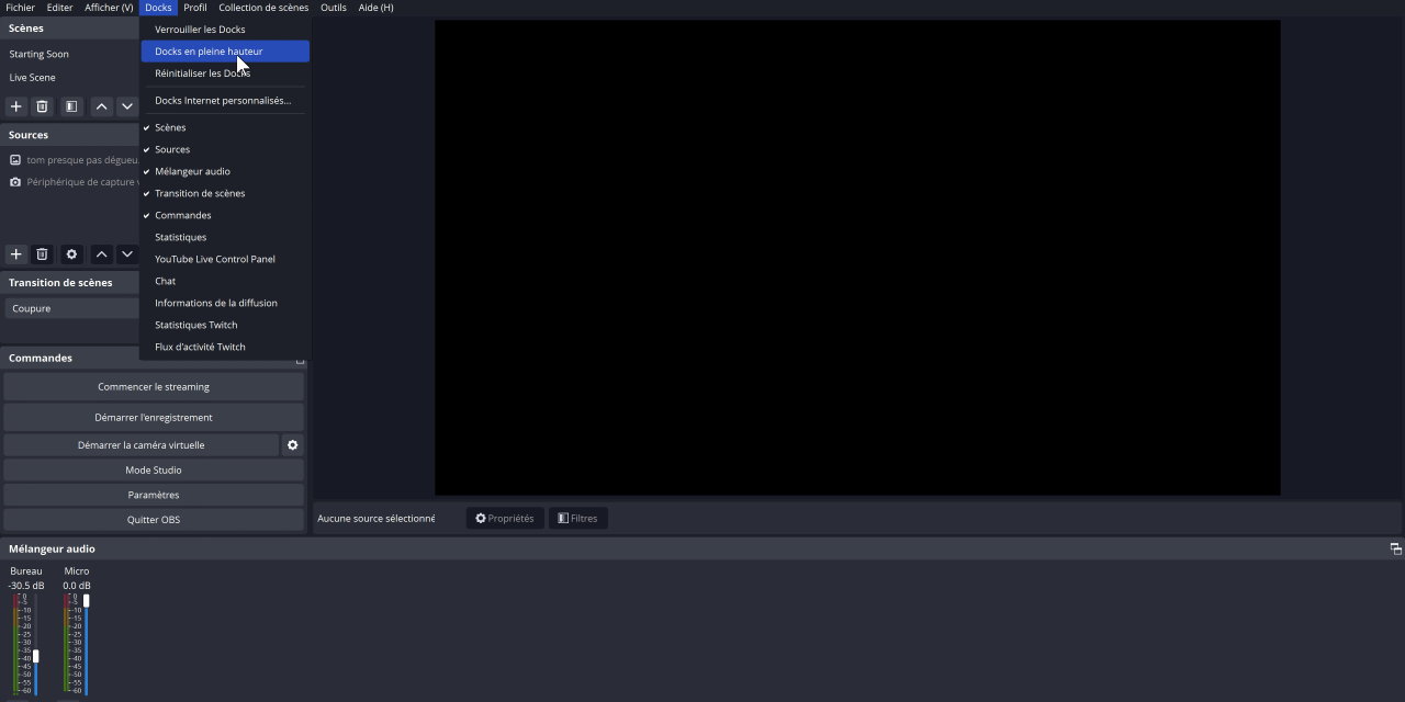 Autre nouveauté, et ça ça permettra encore plus de liberté dans l’organisation d’OBS, c’est la possibilité, ENFIN, de disposer des docks sur toute la hauteur ! C’était tellement indispensable que je ne sais même pas pourquoi ce n’était pas possible avant. Mais voilà, avant on pouvait disposer les docks un peu comme on voulait, mais il y avait toujours cette espèce de barrière entre le bas de la prévisualisation et le reste. Eh bien grâce à une option dans le menu Docks, on peut désormais ajouter des docks sur toute la hauteur de l’interface, et quand on a un milliard de scènes, c’est quand même un sacré confort. Donc ça pour le coup, nouveauté bienvenue, merci pour ça !