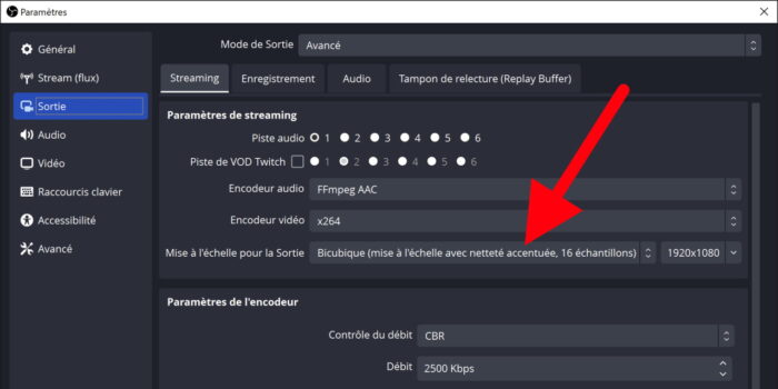 - Downscale (réduire l’image, e.g. canevas en 1080p → stream en 720p) : le Bicubic est une bonne option, le Lanczos fonctionne aussi.
