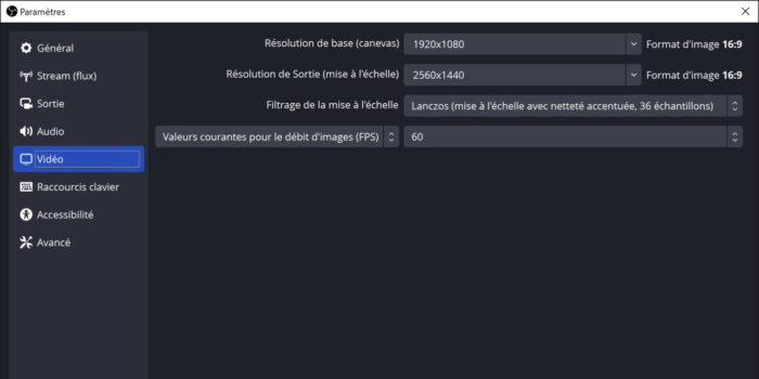 Eh bien avec la nouvelle option, je peux choisir le filtrage directement dans le menu Sortie. Donc dans le menu Vidéo je peux tout laisser en 1080p, puisque mon stream est aussi en 1080p, et dans l’onglet Enregistrement je vais pouvoir upscaler ma vidéo en 1440p avec le filtre Lanczos. Alors c’est une situation un peu particulière, la plupart du temps on règle le filtrage de mise à l’échelle directement dans l’onglet Vidéo, ça fonctionne évidemment.