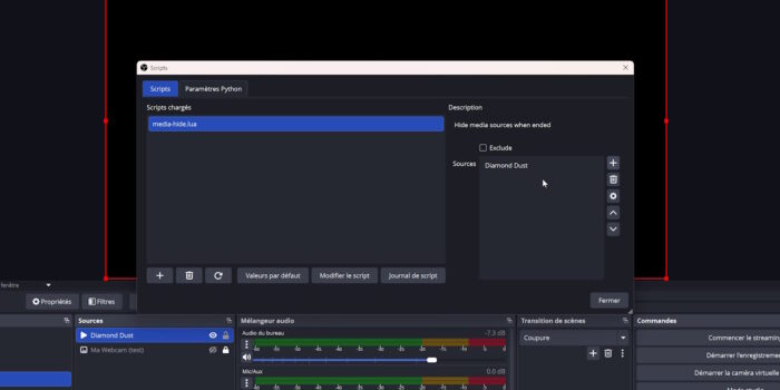 Premier script du jour, c’est Media Hide, trouvé sur le GitHub d’Exeldro et qui existe aussi en version modifiée sur le forum d’OBS sous l’appellation « auto-hide media when finished playing« . Si vous parlez allemand, vous aurez tout de suite compris de quoi il s’agit, pour les autres c’est très simple, le script permet tout simplement de masquer une source média une fois sa lecture terminée. Par exemple, si vous ajoutez une vidéo dans n’importe quelle scène sur OBS, dès que la vidéo sera terminée, la source sera masquée automatiquement.