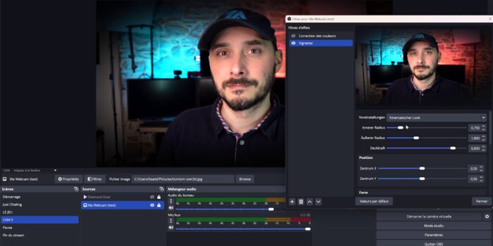 Et on va terminer avec Vignetter, qui va donner du style à vos sources, notamment votre webcam, mais pourquoi pas d’autres sources. Comme son nom l’indique, ce script permet d’ajouter un effet vignette sur une source vidéo ou une image. Si à la base cet effet est involontaire car la lumière frappe tout simplement moins sur les capteurs photo ou vidéo, on peut éventuellement s’en servir en graphisme, soit pour donner du style, soit pour focaliser l’attention sur le centre de l’image en ajoutant cet assombrissement en périphérie.