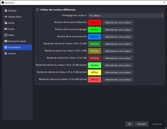 Un petit mot sur le menu Accessibilité, qui n’a aucun rapport avec les réglages du stream, mais c’est un menu important pour les personnes souffrant de daltonisme par exemple, vous allez pouvoir y régler les couleurs utilisées par le logiciel, donc voilà j’estime que c’est important d’en parler aussi.