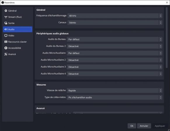 - Périphériques : les périphériques par défaut sont normalement ceux que vous utilisez sous Windows, donc à priori pas besoin d’y toucher sauf si vous voulez forcer un périphérique spécifique, comme un micro, et tous les périphériques audio disposeront d’une piste audio associée dans le mélangeur audio d’OBS.