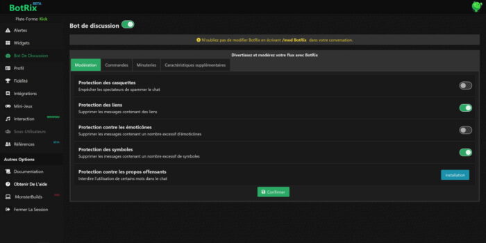 Le premier est BotRix, c’est un bot assez simple et le site est encore en bêta même si ça commence à faire un moment qu’il est sorti. Je vous l’avais par ailleurs présenté plus en détails dans la vidéo montrant comment configurer un chatbot pour Kick, donc on va refaire un tour d’horizon rapide.