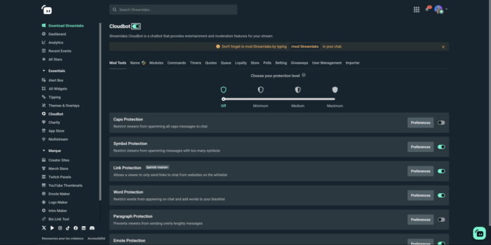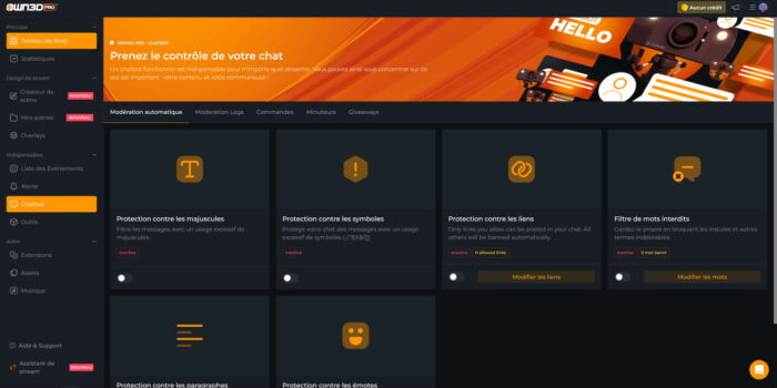 - Modération : généralement très simple avec une protection contre les majuscules, les liens, le spam d’émotes, de symboles et les mots interdits.