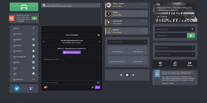 Permet de relayer les alertes de stream dans le chat, avec un nombre impressionnant d’options. Propose aussi une fonction de message de bienvenue, souvent appréciée mais à utiliser avec parcimonie. Enfin, il permet de modifier certaines informations sur Twitch, comme le titre du stream ou la catégorie.