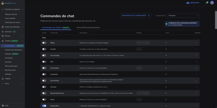 - Commandes : elles sont à taper dans le chat et renvoient une réponse de la part du bot. La plupart du temps, il est possible d’utiliser des variables (nom d’un utilisateur, nombre de followers, compteurs, etc) et de déterminer un rang pour l’utilisation de chaque commande, que vous pourrez par exemple réserver aux abonnés ou aux modérateurs.