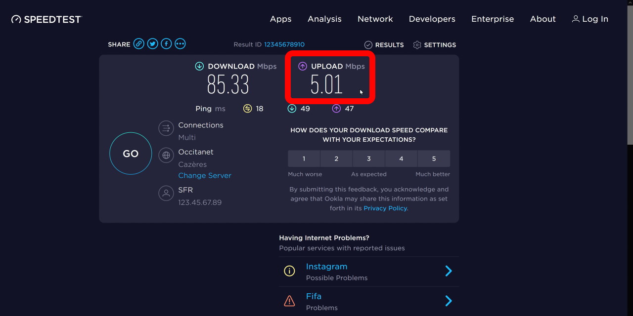 Autre point, pour déterminer quel bitrate maxi vous pouvez régler, il faut déterminer la vitesse de votre débit montant, donc faites un Speedtest et regardez combien vous avez en upload, il faudra absolument rester sous cette valeur. Exemple ici, j’ai un upload de 5 Mbps, donc je ne pourrai pas envoyer un débit supérieur à 5000 kbps (1 M = 1000 k), tout en gardant à l’esprit qu’il faut prendre en compte les 160 kbps de débit audio et toujours se laisser 10-20 % de marge au cas où, donc avec mon upload à 5 Mbps, pour le débit vidéo je pourrai par exemple monter à 4000 ou 4500 grand max !