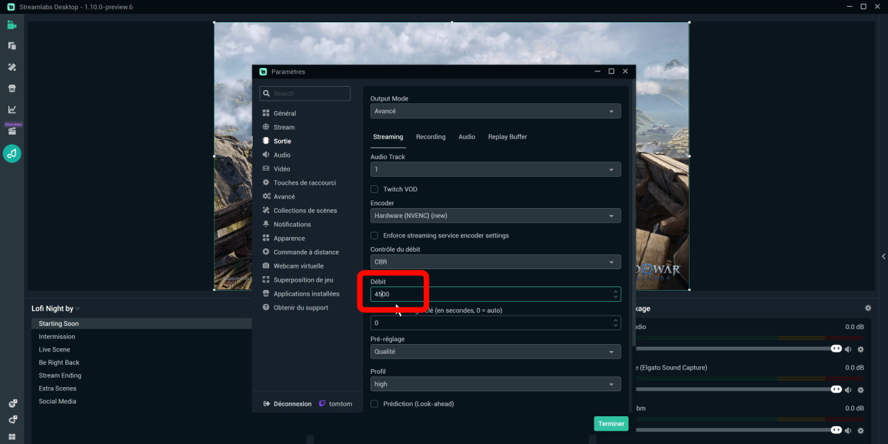 Il nous reste à choisir les derniers réglages, qui sont les plus importants, la résolution de sortie, donc la résolution du stream, et le bitrate ou débit vidéo, qui va conditionner la qualité du stream. L’un ne va pas sans l’autre, plus on monte la résolution de sortie, plus il faudra un bitrate élevé pour avoir une bonne qualité et plus il faudra de puissance pour encoder. Ce n’est pas trop un problème quand on encode avec Nvenc ou Quick Sync car ce sont des encodeurs matériels, mais quand on encode en x264 il faudra aussi faire attention au pré-réglage qu’on utilise.
