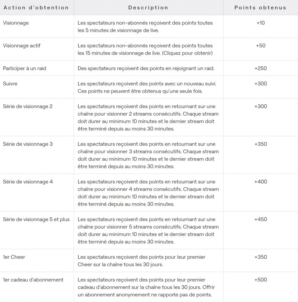 La façon la plus simple de gagner des points de chaîne, c’est tout simplement en regardant un live puisqu’on peut gagner 10 points toutes les 5 minutes de live et 50 points toutes les 15 minutes en étant actif (i.e. en cliquant sur un coffre bonus). Au passage, sachez que si vous êtes abonné à une chaîne, les gains seront multipliés par 1,2 (abonné de niveau 1), 1,4 (abonné de niveau 2) ou 2 (abonné de niveau 3). Mais on peut aussi gagner des points avec d’autres évènements :