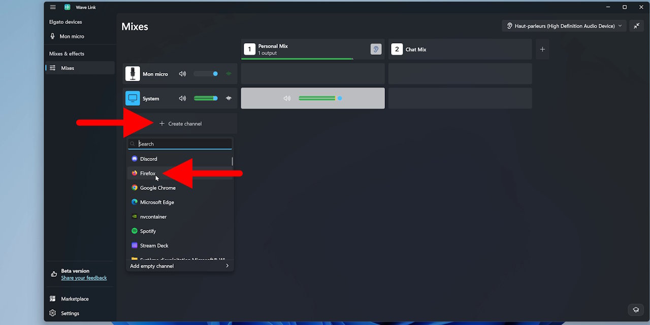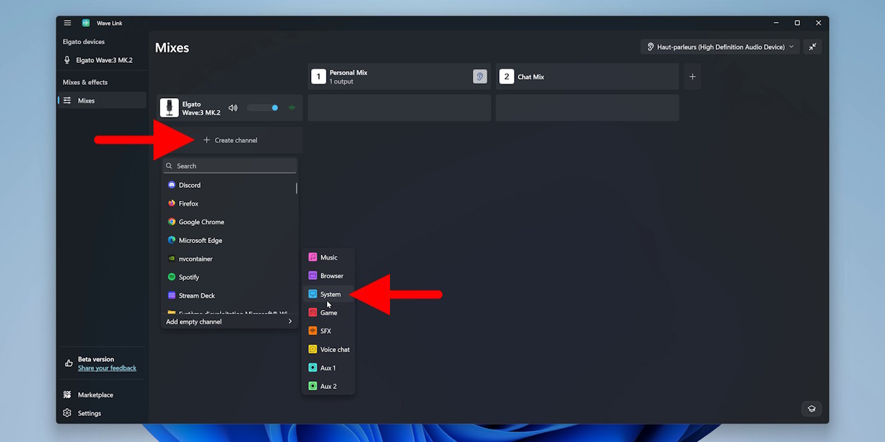 Ensuite, dans la colonne de gauche, on va ajouter les entrées audio en cliquant sur « Create channel ». Attention, dès que vous allez commencer à ajouter une entrée, vous n’entendrez peut-être plus les sons du PC, donc moi ce que je fais, j’ajoute une entrée vide System, qui sera reprise par Windows au bout de quelques secondes en tant que sortie principale, ensuite je l’ajoute à mon Personal Mix, mix que je monitore dans mon casque en cliquant sur l’icône en forme d’oreille, et voilà, là j’entends bien tous les sons de mon PC.