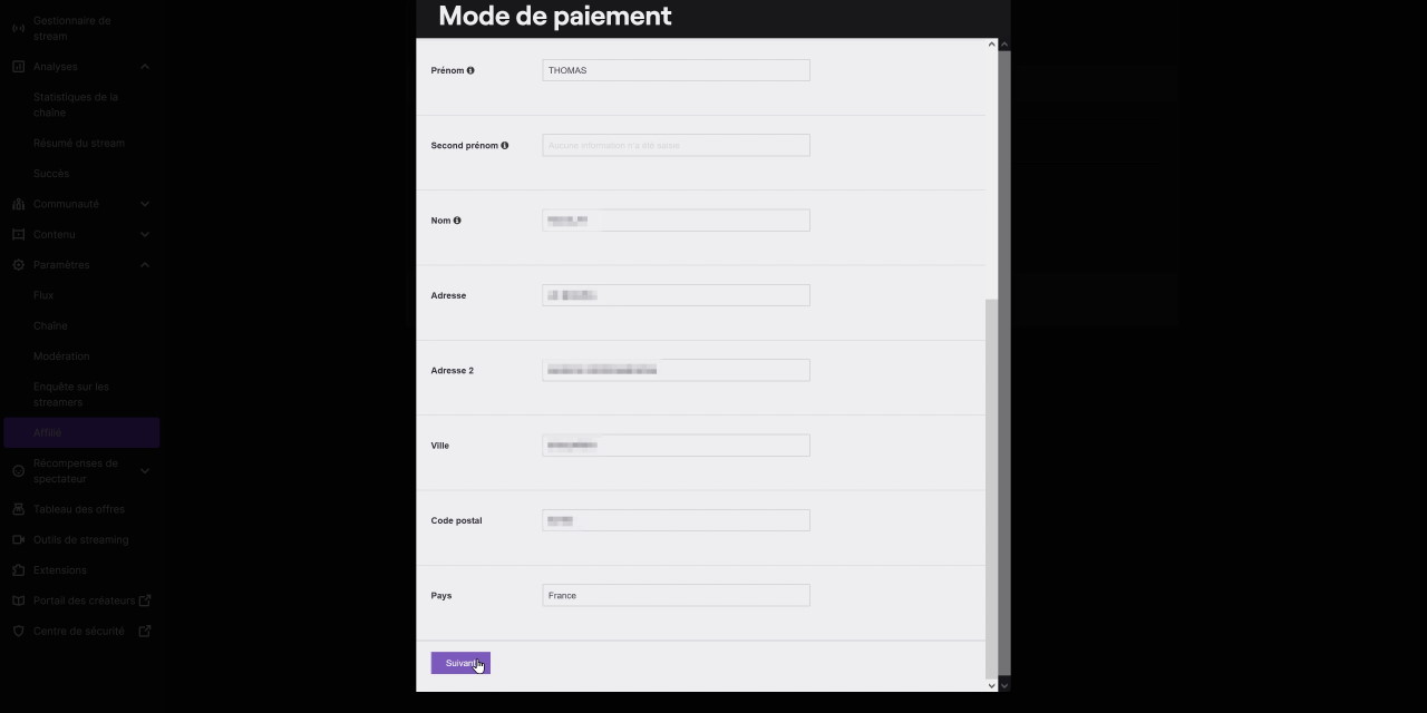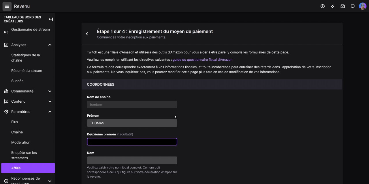 Et voilà pour l’intégration au programme affilié Twitch et les formulaires fiscaux tant redoutés. J’insiste une dernière fois sur le TIN, le numéro fiscal, car si vous ne le renseignez pas, il est possible que selon votre situation vous ayez une retenue de 30 % sur vos gains, ça serait vraiment dommage.