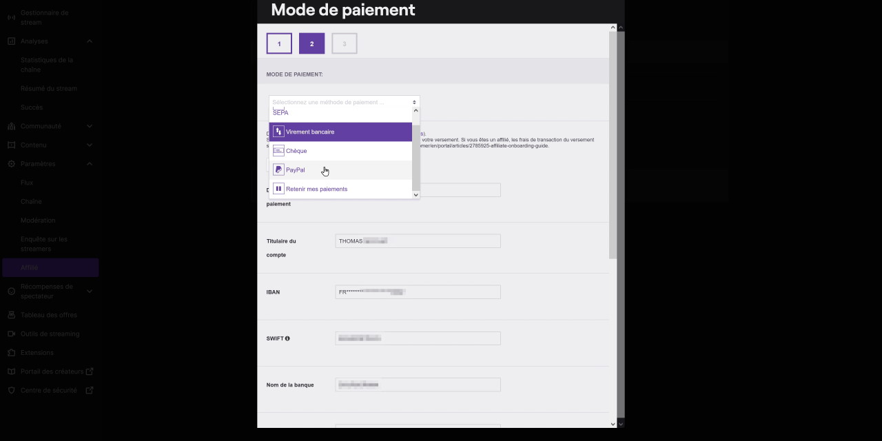 Il nous reste encore une étape, qu’on peut remplir plus tard d’ailleurs, c’est la configuration des paiements. Il est rappelé qu’il faut atteindre au moins 100$ de gains avant de pouvoir recevoir un paiement, et on peut donc configurer un mode de paiement. Sur la 1re partie du formulaire, on retrouve nos coordonnées pré-remplies, à priori tout devrait être bon ici, donc on peut passer à la suite. Et sur la 2e page on va littéralement choisir notre moyen de paiement. On a plusieurs options, les plus fréquentes étant Paypal, le chèque ou le virement bancaire. Alors attention car il y a des frais pour chaque mode de paiement. Le plus avantageux et ce que tout le monde choisit en général c’est plutôt Paypal, et ça implique évidemment que vous ayez un compte Paypal. Sinon par chèque il n’y a pas beaucoup de frais. Personnellement j’ai choisi le virement bancaire, mais en tant que partenaire les frais sont pris en charge par Twitch, donc c’est un peu différent. Bref, choisissez le mode de paiement que vous préférez, validez et c’est fini !