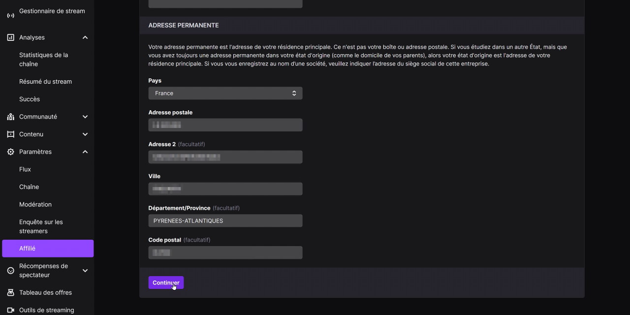 Ensuite on a la partie où il faut renseigner son adresse, donc remplissez tout en majuscules, une fois de plus, et n’oubliez pas d’ajouter le département, même si c’est facultatif. Ce formulaire pose problème chez certaines personnes, et on limite le risque de bugs en renseignant le département, donc allez-y. Et pour terminer on clique sur « Continuer ».
