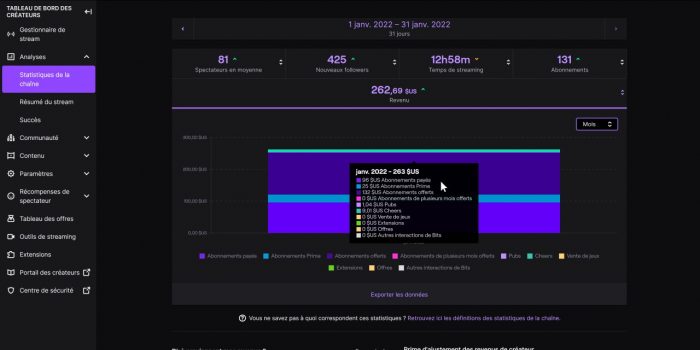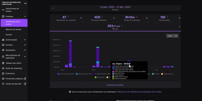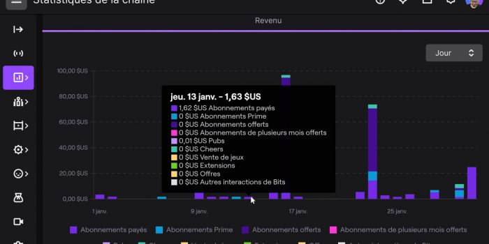 D’où la remarque suivante, qui est que si vous arrivez à devenir partenaire Twitch, donc l’étape après affilié, la répartition des revenus change pour les abonnements de niveau supérieur, et vous toucherez ainsi 60 % sur un abonnement de niveau 2 et 70 % sur un abonnement de niveau 3. Alors pour le fun j’ai fait le calcul sur ma chaîne, j’ai pris l’exemple du 31 janvier 2022 où j’ai eu 2 abonnements de niveau 3 le même jour. Gain de 25 $, donc 12,5 $ pour un seul Sub T3, soit environ 11 €. Bah chez moi, 11 € ça ne représente pas 70 % des 20 € du prix d’un Sub T3, ça représente 45 %… Bref, outre le fait que Twitch nous enfume avec cette répartition, vous vous rendez bien compte qu’il va falloir un paquet de Subs pour tirer un revenu substantiel sur une chaîne Twitch.