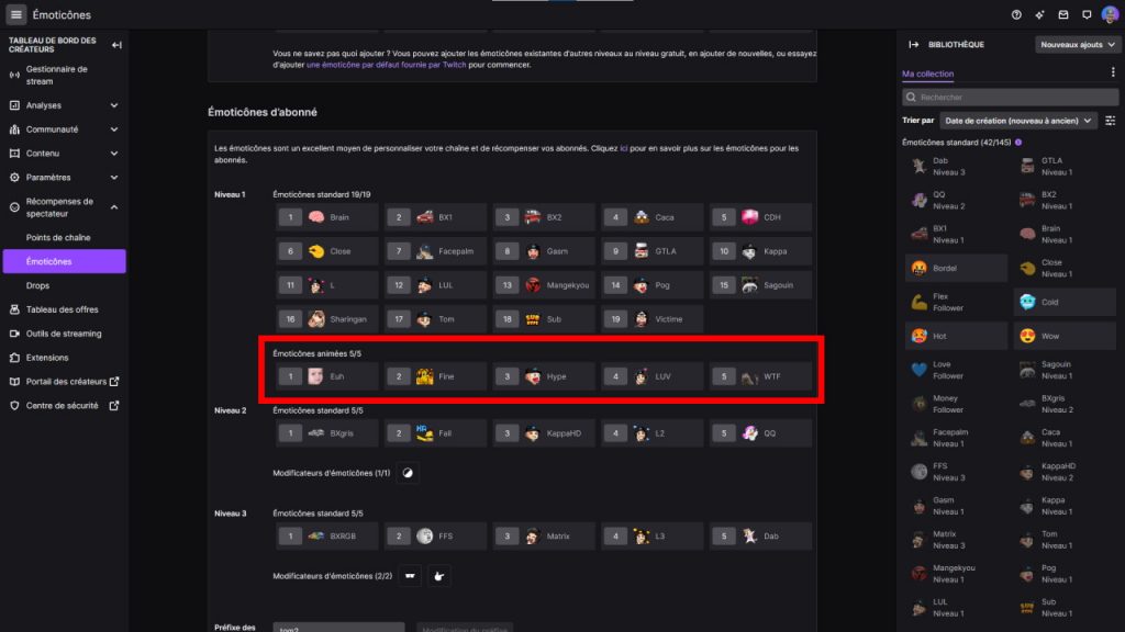 Je passe sur le fait que vous pouvez trouver des GIF assez facilement en faisant une recherche sur Google ou autre, là on va partir du principe que vous avez déjà quelques émotes classiques sur votre chaîne. Twitch propose donc d’animer vos émotes, pour ça il suffit d’aller dans votre tableau de bord → Récompenses des spectateurs → Émoticônes, et là vous pourrez voir une section réservées aux émotes animées.