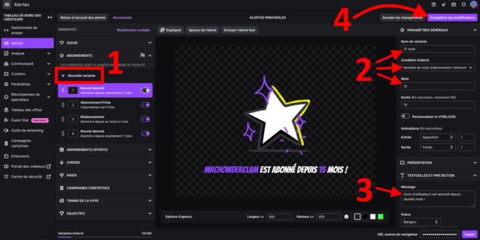 Pour définir une variante, on va donc prendre l’exemple rapide des abonnements. Par défaut Twitch crée les 3 variantes que j’ai mentionnées juste avant, mais si je veux ajouter une 4e variante, par exemple quand un viewers cumule 12 mois d’abonnement, je vais simplement cliquer sur « Nouvelle variante » et je pourrai faire les réglages correspondants dans la partie droite de l’interface.