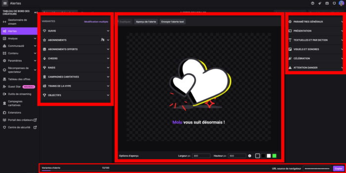 - à gauche : les différents types d’alertes, pour les followers, les abonnements, les cheers, les raids… alors en fonction de si vous êtes affilié ou non, vous n’aurez peut-être pas toutes les alertes, puisqu’il faut être affilié pour débloquer la monétisation et donc les abonnements, les cheers ou le train de la hype par exemple.