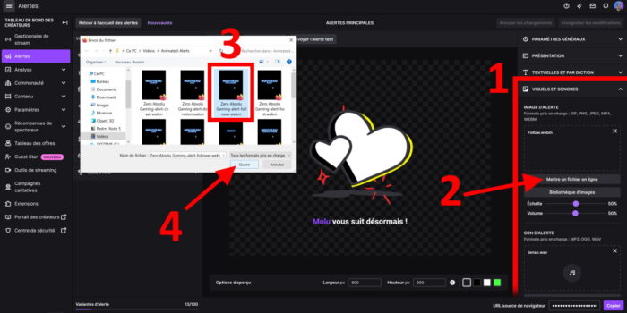 Ensuite je pourrai télécharger les alertes, je décompresse l’archive, j’extrais les fichiers sur mon PC et je pourrai m’en servir pour mes alertes Twitch ! Pour ça, direction l’interface Twitch, et dans la section « Visuels et Sonores » je pourrai Mettre un fichier en ligne, je vais chercher le fichier qui correspond à mon alerte de follow par exemple, je fais pareil avec le son au besoin, c’est comme vous voulez, et c’est tout !
