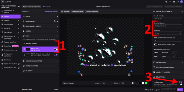 Autre exemple avec une variante pour les raids, que je trouve assez sympa. Je crée donc une nouvelle variante, et je veux qu’elle se déclenche uniquement si ZeratoR raid ma chaîne. Pour ça je vais simplement définir la condition « Ciblé par un raid de », je cherche ZeratoR dans les utilisateurs, je vais activer une célébration bien sûr, parce que se faire raid par ZeratoR c’est pas tous les jours, moi la dernière fois c’était en novembre 2019… Et voilà, si quelqu’un me raid, j’aurai une alerte de base, et si ZeratoR me raid, j’aurai une alerte spéciale !