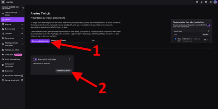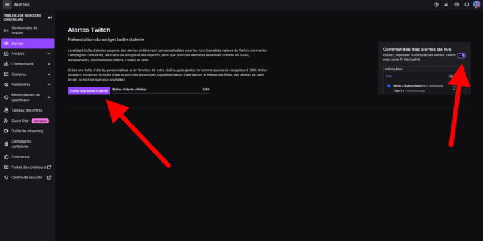 Au début ça sera un peu vide et on va pouvoir créer une première boîte d’alerte, on on a aussi une option pour ajouter des commandes au fil d’actualité, que je vous conseille d’activer, comme ça vous aurez davantage de contrôle sur les alertes dans ce fameux fil d’actualité qu’on retrouve dans le Gestionnaire de stream, avec la possibilité de rejouer les alertes, de les passer ou carrément de les bloquer si vous ne voulez pas être dérangé durant une phase de votre stream.