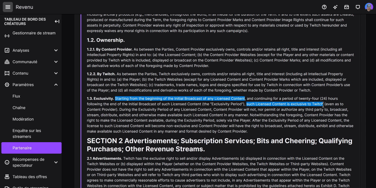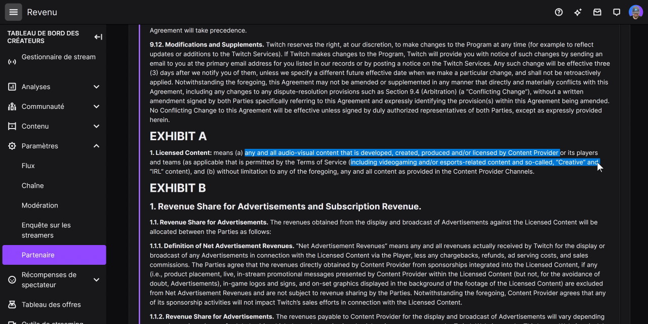En tout cas, la dernière confirmation qui nous intéresse a été donnée dans une vidéo de Zach Bussey relativement récente et dans laquelle il a fait intervenir un avocat, qui a bien expliqué qu’il n’était pas possible aux partenaires de streamer ou de diffuser du « contenu sous licence » (Licensed Content) ailleurs que sur Twitch. Or, ce fameux « contenu sous licence », si on regarde bien dans les annexes du contrat partenaire, ce n’est ni plus ni moins que tout le contenu audiovisuel diffusé ou streamé par le créateur, y compris le contenu autour du jeu vidéo, de l’esport, de la création ou de l’IRL. En gros, si tu es partner, dès que tu lances un stream, Twitch a l’exclusivité dessus. Donc non, tu ne peux pas lancer un stream sur YouTube puisqu’il doit être fait sur Twitch d’abord.