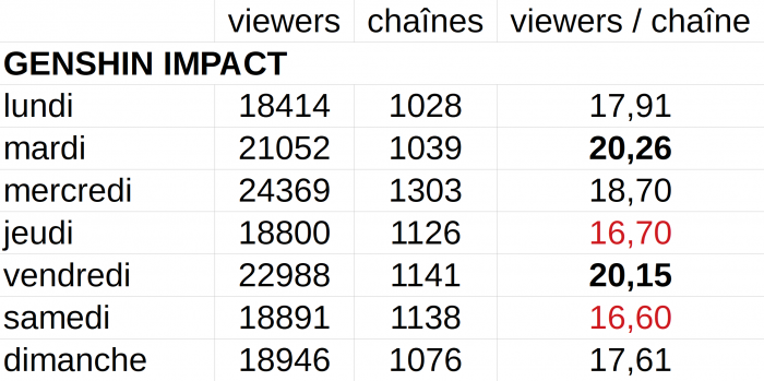Je suis donc allĂ© sur le site TwitchTracker.com et jâai regardĂ© les donnĂ©es du jeu Genshin Impact sur les 6 derniers mois pour limiter au maximum lâimpact quâont pu ou quâauraient pu avoir les Ă©ventuels boost apportĂ©s par des trĂšs gros streamers. Donc premier constat, il y a des jours dans la semaine oĂč il y a plus de viewers : mardi, mais surtout mercredi et vendredi. En revanche, on voit aussi que le mercredi est le jour oĂč il y a le plus de chaĂźnes qui diffusent ce jeu, donc ce nâest pas forcĂ©ment intĂ©ressant.