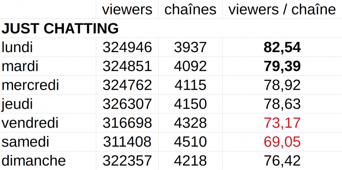 Pour le fun jâai fait la mĂȘme chose avec la catĂ©gorie Just Chatting. Bon, la pour le coup la multitude de streamers Ă©voluant dans cette catĂ©gorie et le fait que certains nây passent que trĂšs vite avant de lancer un jeu, tout ça fait que les donnĂ©es ne sont pas forcĂ©ment trĂšs pertinentes, mais en gros voilĂ ce que ça donne : moins de viewers le vendredi et le samedi, pic de chaĂźnes sur ces mĂȘmes jours, donc logiquement, le ratio viewers/chaĂźne nâest pas faveur de ces deux jours-lĂ et profite au lundi et au mardi.