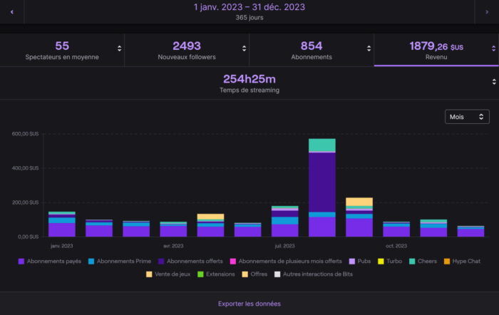 Du coup j’en arrive au volet financier. Ces trois mois de stream m’ont permis de générer davantage de revenus que d’habitude, ça paraît logique vu que j’ai streamé davantage. J’ajoute qu’il y a un autre biais énorme à prendre en compte ici, c’est que durant le mois d’août il y a eu le Hype Challenge sur Twitch, et pour la blague j’avais même fait un stream spécial NPC qui a finalement été plutôt bien reçu, n’en déplaise à ceux dépourvus de second degré. Donc revenus en hausse, avec un mois à 500 euros et une moyenne à 330 euros par mois.