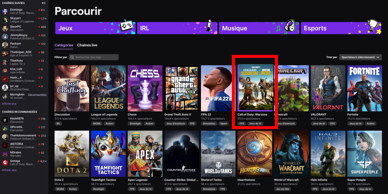 Et là certains me diront que par défaut, ce n’est pas trié par nombre de spectateurs décroissants comme c’était le cas avant, mais par chaînes recommandées. Et c’est vrai. Mais plus il y aura de streamers, moins vous aurez de chances d’être recommandés, c’est l’évidence. Donc au final, on en revient au même point. Des nouveaux streamers il y en a tous les jours, donc il faut se démarquer ou essayer des catégories plus porteuses. Donc à titre personnel, je vous conseillerais d’oublier les catégories les plus populaires sur Twitch.