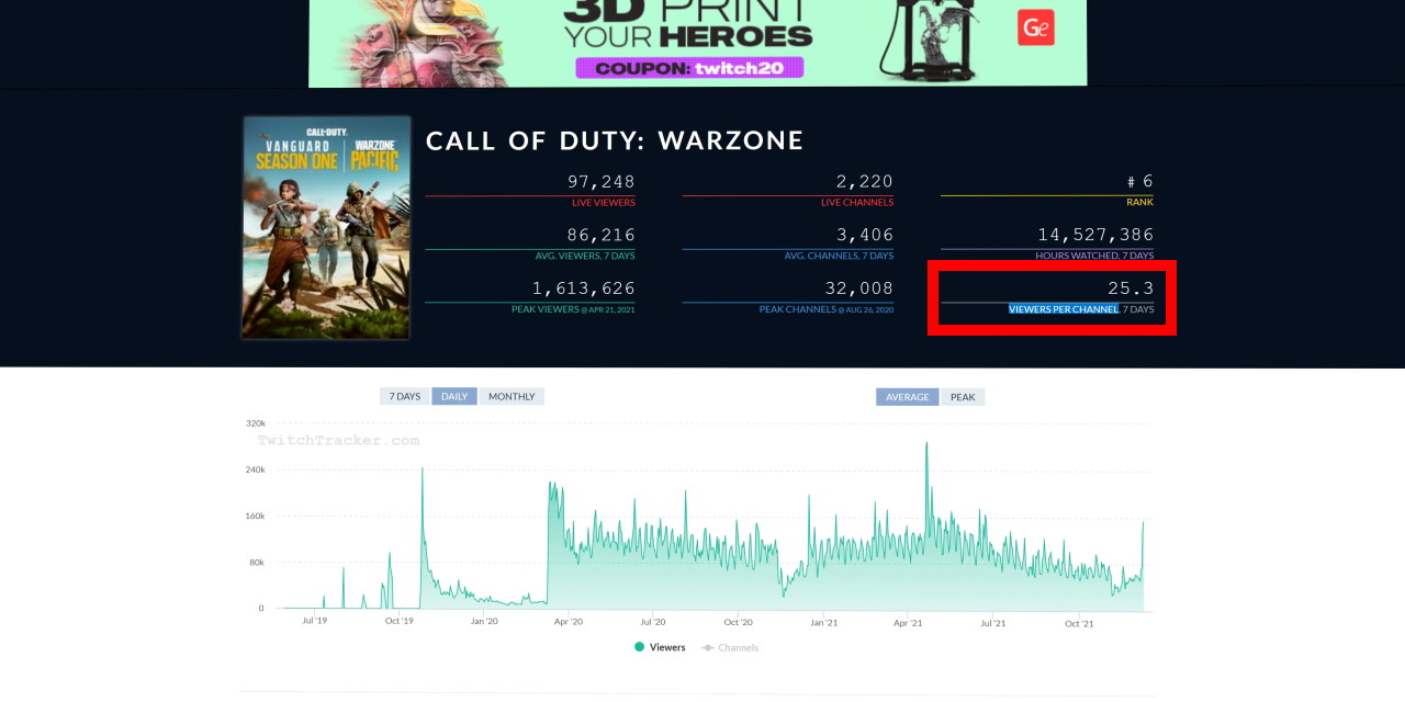 Déjà on peut reparler des jeux saturés. Pourquoi « saturés » ? Eh bien tout simplement parce qu’il y a peut-être beaucoup de viewers dans ces catégories qu’on retrouve souvent en tête des jeux sur Twitch, mais il y a aussi énormément de streamers. Exemple basique avec Warzone, ici le 6e jeu le plus populaire sur Twitch. Si on regarde les statistiques, on pourrait presque se dire que c’est OK, avec une moyenne de 25 viewers par chaîne c’est cool, moi aussi j’aimerais bien 25 viewers sur mon live, et on pourrait penser que si on arrive à bien se positionner on peut récupérer pas mal de viewers.