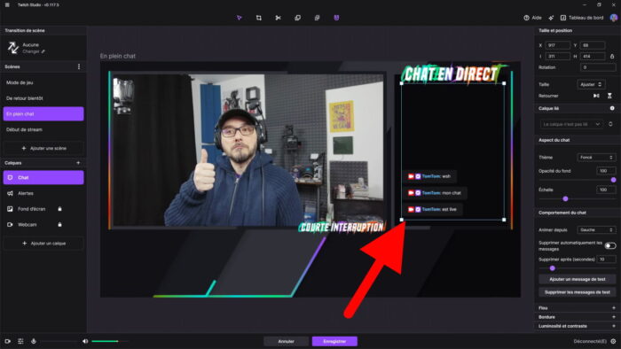 Il reste à ajouter le chat Twitch, et là aussi on a déjà un calque à portée de main, donc on va simplement le glisser-déposer dans son cadre et l’étirer pour qu’il remplisse tout. On pourra éventuellement le personnaliser un peu via les options dans la partie droite de l’interface, mais en l’état on a déjà un chat fonctionnel qui apparaîtra sur notre overlay.