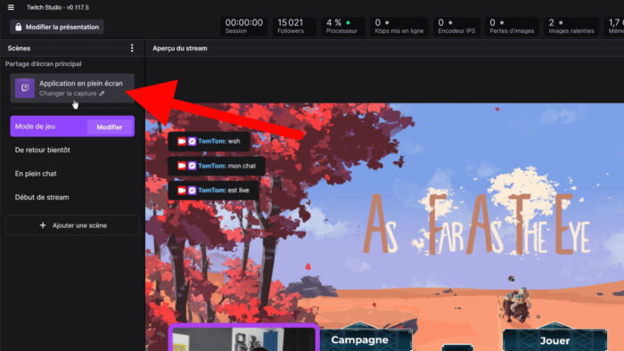 Par défaut, toute application en plein écran sera capturée. Donc si je lance un jeu et que je le mets en plein écran, si je reviens sur Twitch Studio, je verrai que mon jeu est bien capturé. Mais parfois ça fonctionne mal, dans ce cas on peut choisir de capturer une fenêtre spécifique, ou de capturer l’écran complet, et ça c’est une option qui sera plutôt utilisée si vous avez deux moniteurs. Donc à vous de voir la méthode que vous privilégiez, à priori la capture des applications en plein écran fonctionne bien.