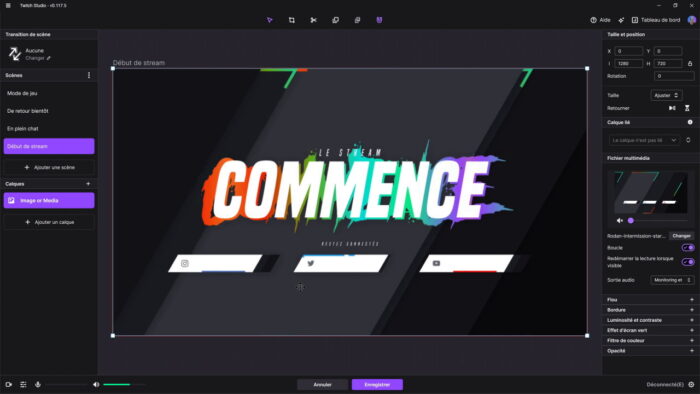 NB : il existe aussi une version vierge avec le suffixe « blank » qui ne comporte pas les réseaux sociaux. - Sélectionner le fichier dans l’explorateur et valider, le sélectionner à nouveau dans l’interface de Twitch Studio et valider.