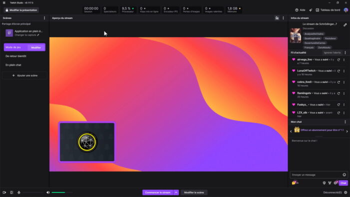 - une barre en haut avec des informations diverses comme le temps de stream, le nombre de spectateurs, les pertes d’images, etc, mais aussi l’accès au tableau de bord Twitch tout à droite.