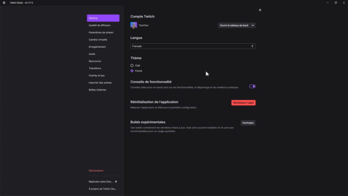On y trouve les liens vers diverses pages de notre chaîne Twitch, la langue et également la possibilité de changer le thème de l’application, rien de bien intéressant ici.