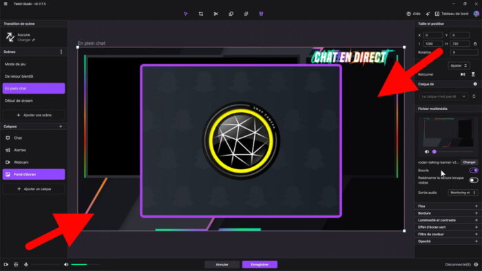 Pour la scène de discussion, on va modifier la scène existante et simplement remplacer le fond et ajouter notre webcam, le reste étant déjà en place, à savoir le chat Twitch et les alertes de stream.